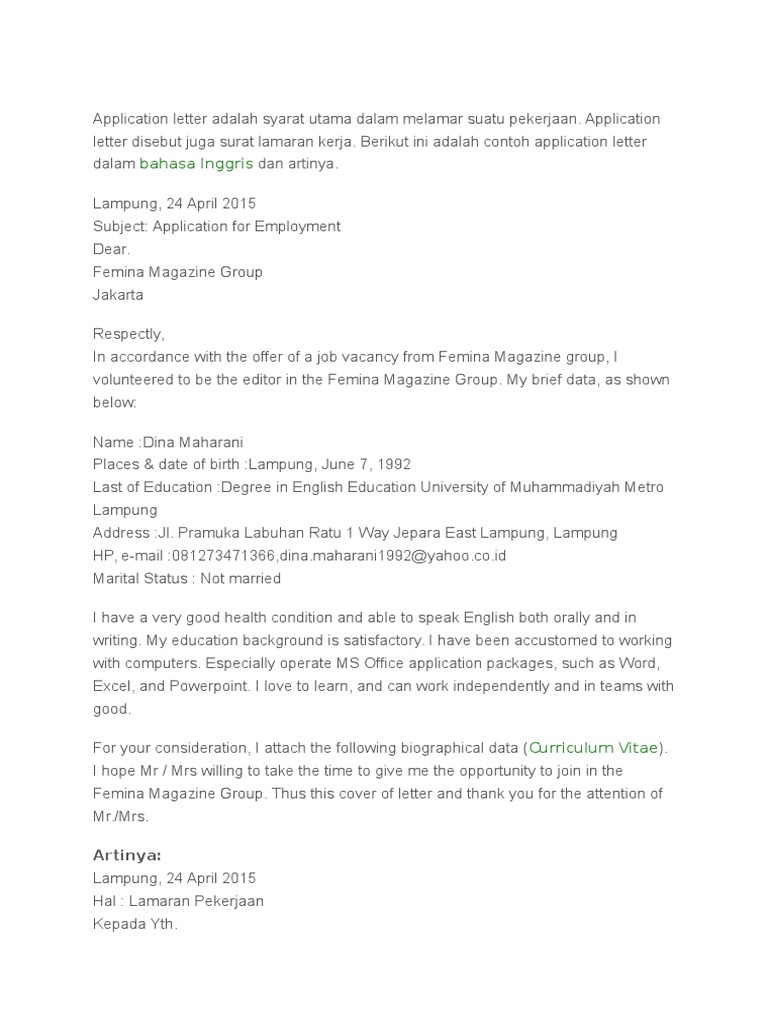 It shows my overall expertise and experience in the field. You should include all the instructions. Jadi cover letter merupakan semacam surat pengantar yang harus bin wajib disertakan saat kamu mengirim cv dan/atau resume, kecuali perusahaan secara spesifik meminta untuk tidak mencantumkan cover letter. Surat ini biasanya disertakan dengan resume yang berisi mengenai informasi tambahan terkait kemampuan dan pengalaman kerja sang pelamar. Isi dari cover letter adalah deskripsi singkat tentang diri anda dan menunjukkan posisi apa yang akan kita lamar. Sama dengan surat lamaran, cover letter adalah surat pengantar ketika anda melamar suatu pekerjaan. Online writing service includes the research material as well, but these services are for assistance purposes only. Especially if they meet a hot academic season and have a job for making some money at the same time. According to a recent survey, 94% of all copies ordered from our professionals will be delivered before the deadline. Contoh application letter cv dan artinya. Application letter atau sering disebut juga dengan nama cover letter.application letter adalah dokumen yang dipergunakan untuk melamar kerja. Isinya pernyataan melamar kerja, pencapaian, bahkan kemampuan. Your cover letter should include the following things: